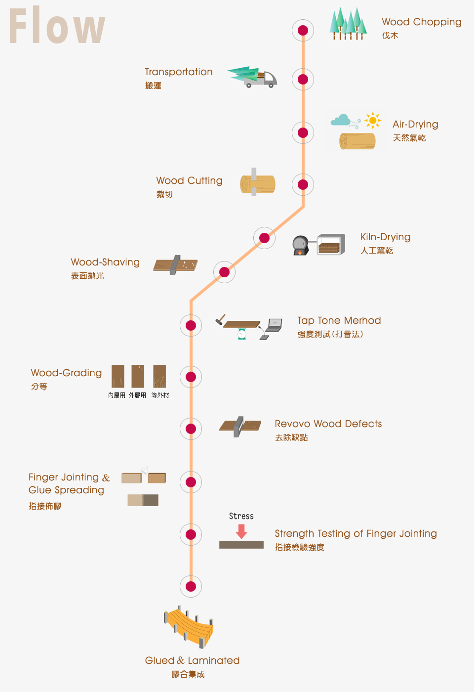 • 隨著天然資源快速的被開發,原始林日益減少,造林木的利用成為目前世界林產工業重要的目標。從永續性生物材料的運用與發展綠建築(Ecological building)的訴求可知,木質構造建築實為最符合綠建築要求之建築類型,國內近年來對於木構造房屋之接受性增高,然而因受限於大斷面木質材料之製造技術與相關結構設計系統均付之闕如,使得許多大型木構造建築仍未能普及。德豐木業透過與學術機構合作,擬定集成材製作技術之開發為重點發展方向,除了提升市場競爭力,更期望普及應用木質材料於大型木構建築,發揮永續性生物材料的價值。